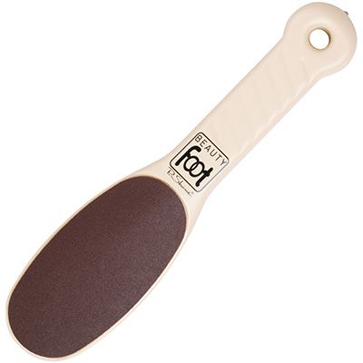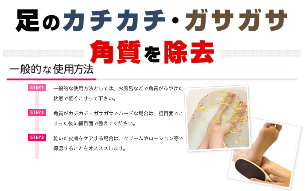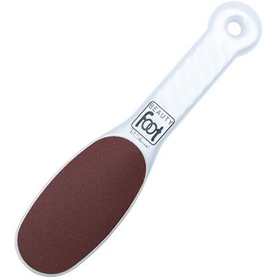 ビューティーフットを軽く湿らせて目の粗い平らな面でかかとをこすります。この際には必ず、足は充分ふやかしてから始めて下さい。