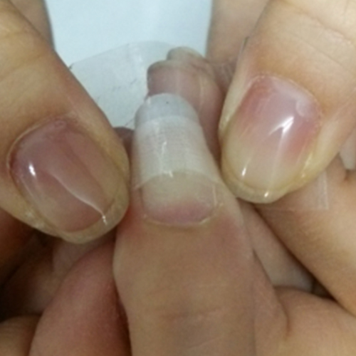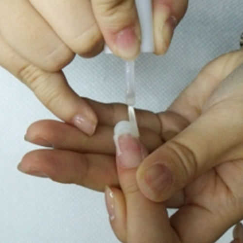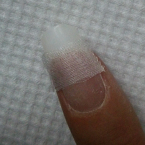 繊維の裏側全面に粘着剤をドット状に配置することにより、繊維を通して爪表面にまでネイルグルーを十分に行き渡らせ、透明感を持たせながら接着強度をあげることができます。