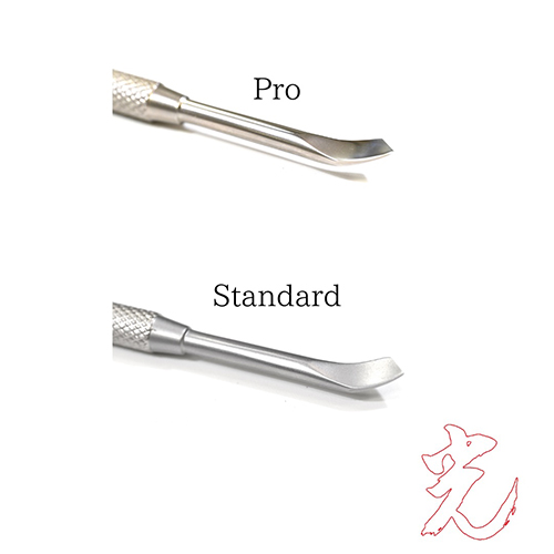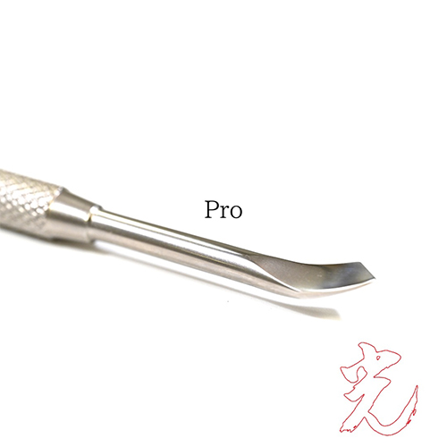 通常のプッシャーは、焼き入れ処理をしていないため硬度が20度ほど(HRC)と とても柔らかく、数週間に1度ファイルで研磨をしなければ使えませんが、このプッシャーは焼き入れ処理をすることで硬度が50度(HRC)まで入れることが可能です。シザー並みの硬度が入るため、ファイリングをしなくても長く使える仕様です。