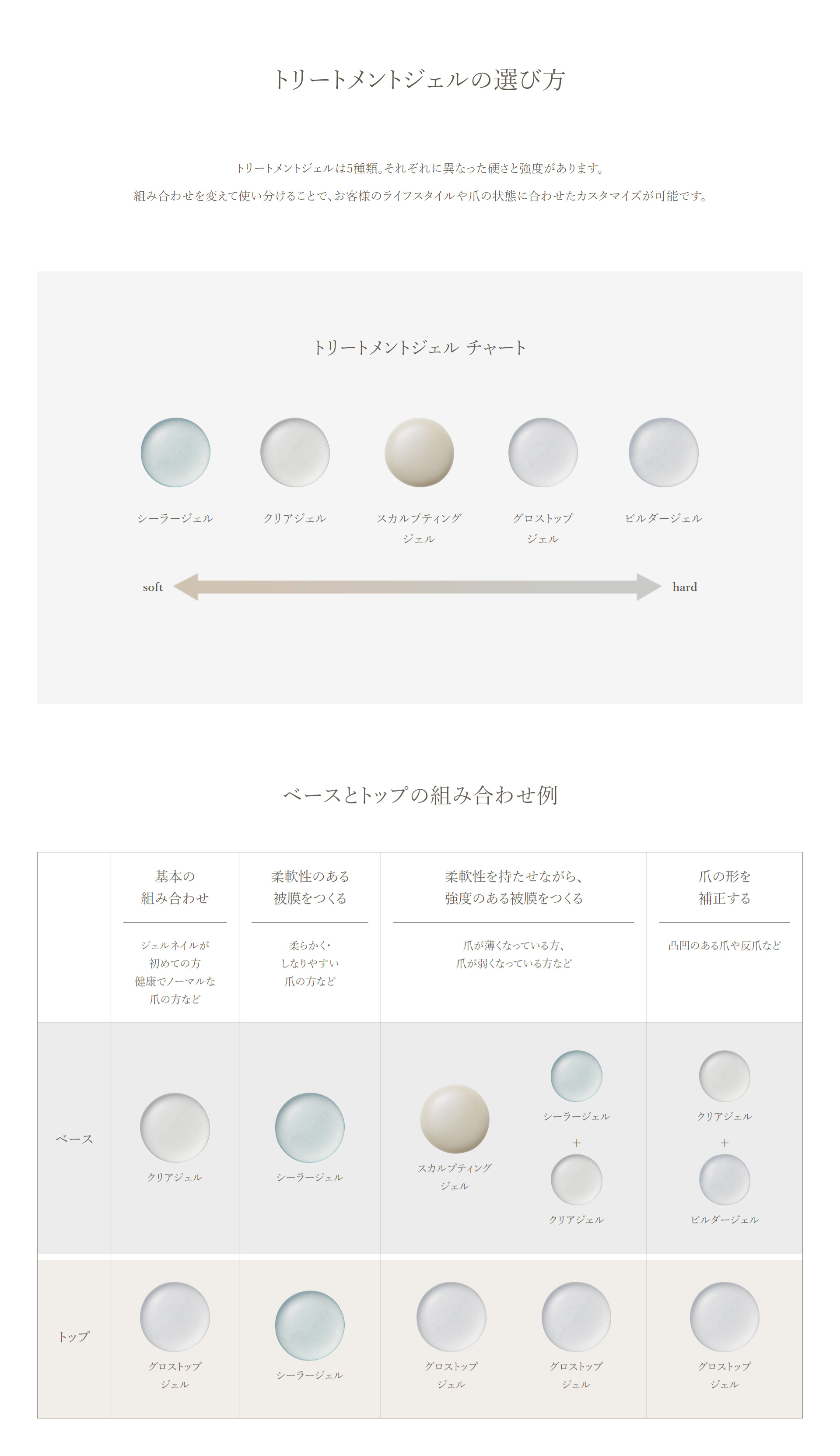 組み合わせを変えて使い分けることで、お客様のライフスタイルや爪の状態に合わせたカスタマイズが可能です。
