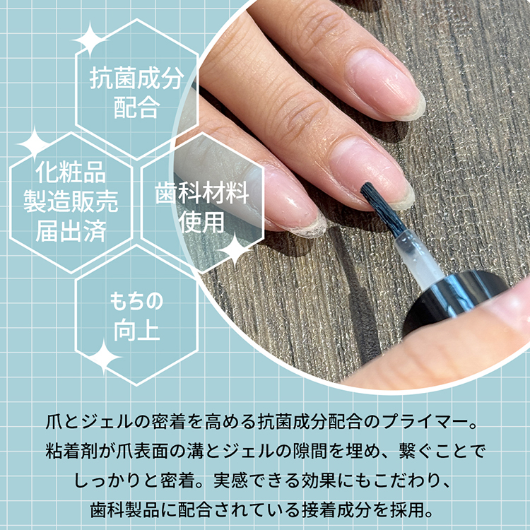 爪とジェルの密着を高める抗菌成分配合のプライマー。