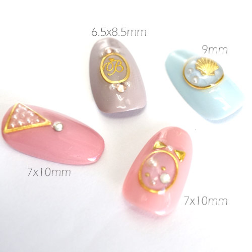 高品質でカーブ付メタルフレームです♪少し厚さがあるのでジェルを多めに乗せてビジューにしたり、ブローチネイルやフレームとして中にストーンやブリオンを並べたり色々使える!レジンやデコにもオススメです。